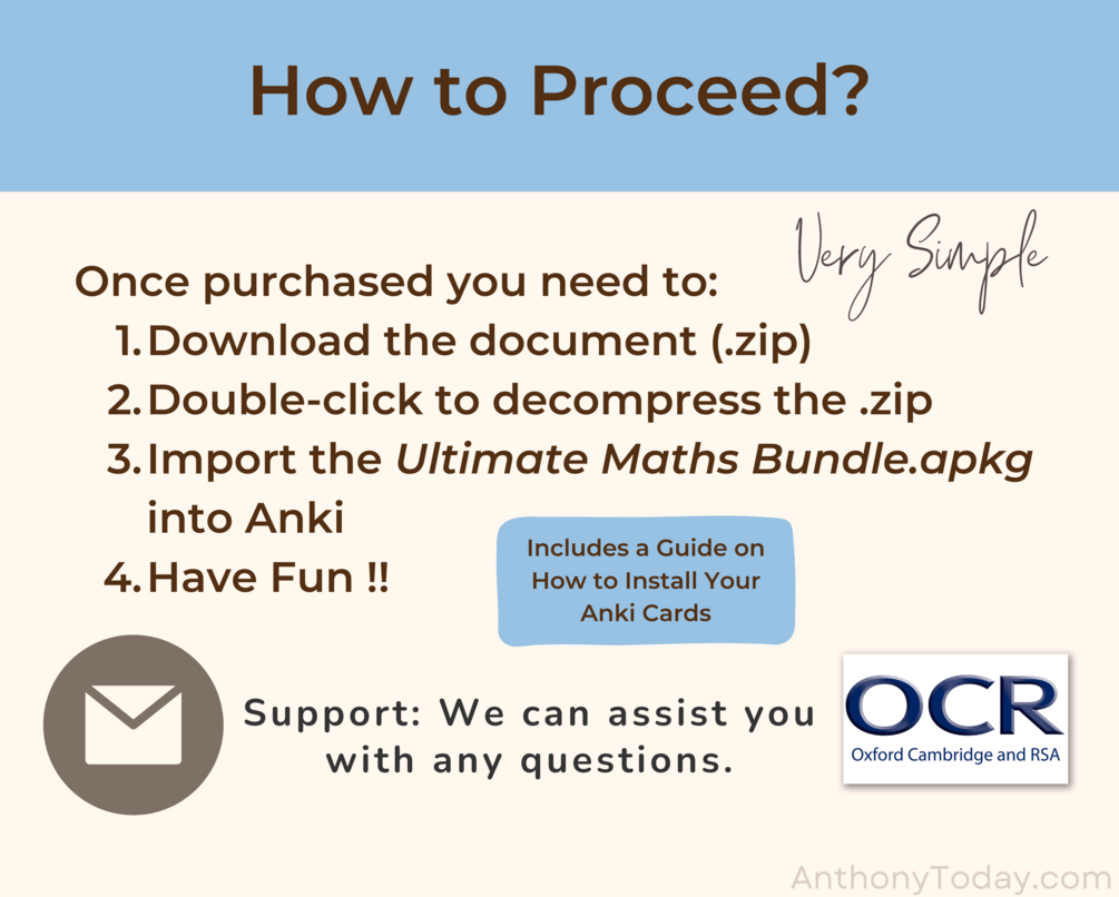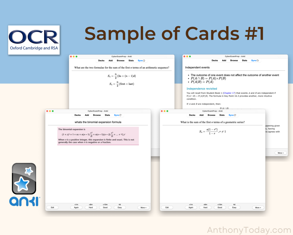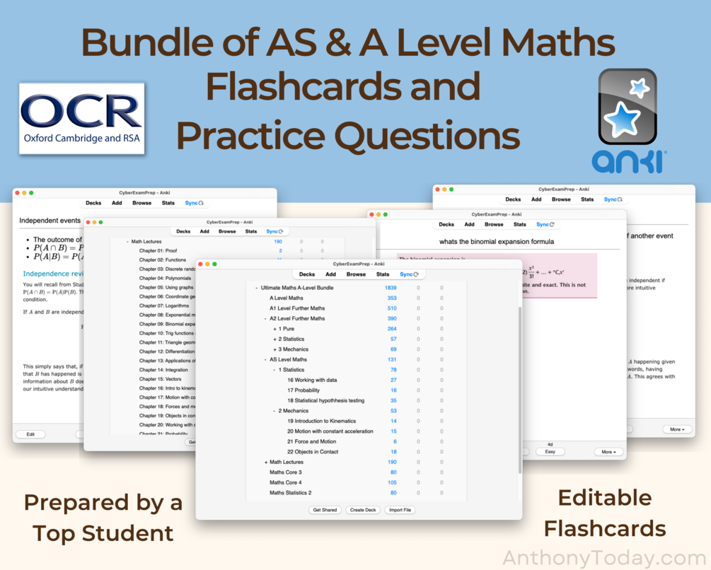 - Bundle of +1800 Anki Flashcards, covering multiple Math Exams (A Level Math, AS Level, A Level Further Math, AS Level Further Math, Math Core 3, Math Core 4, and Math Statistics 2)